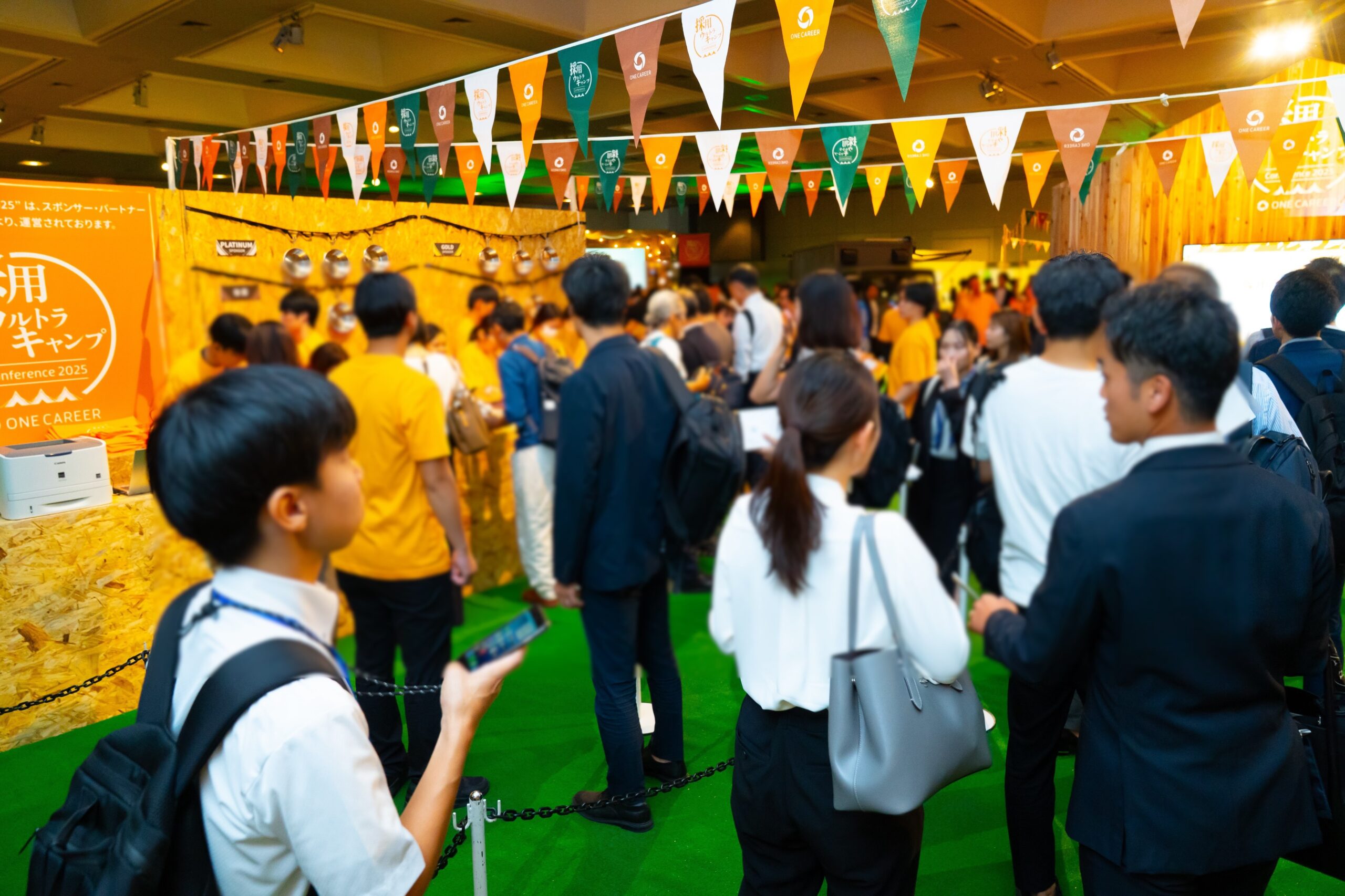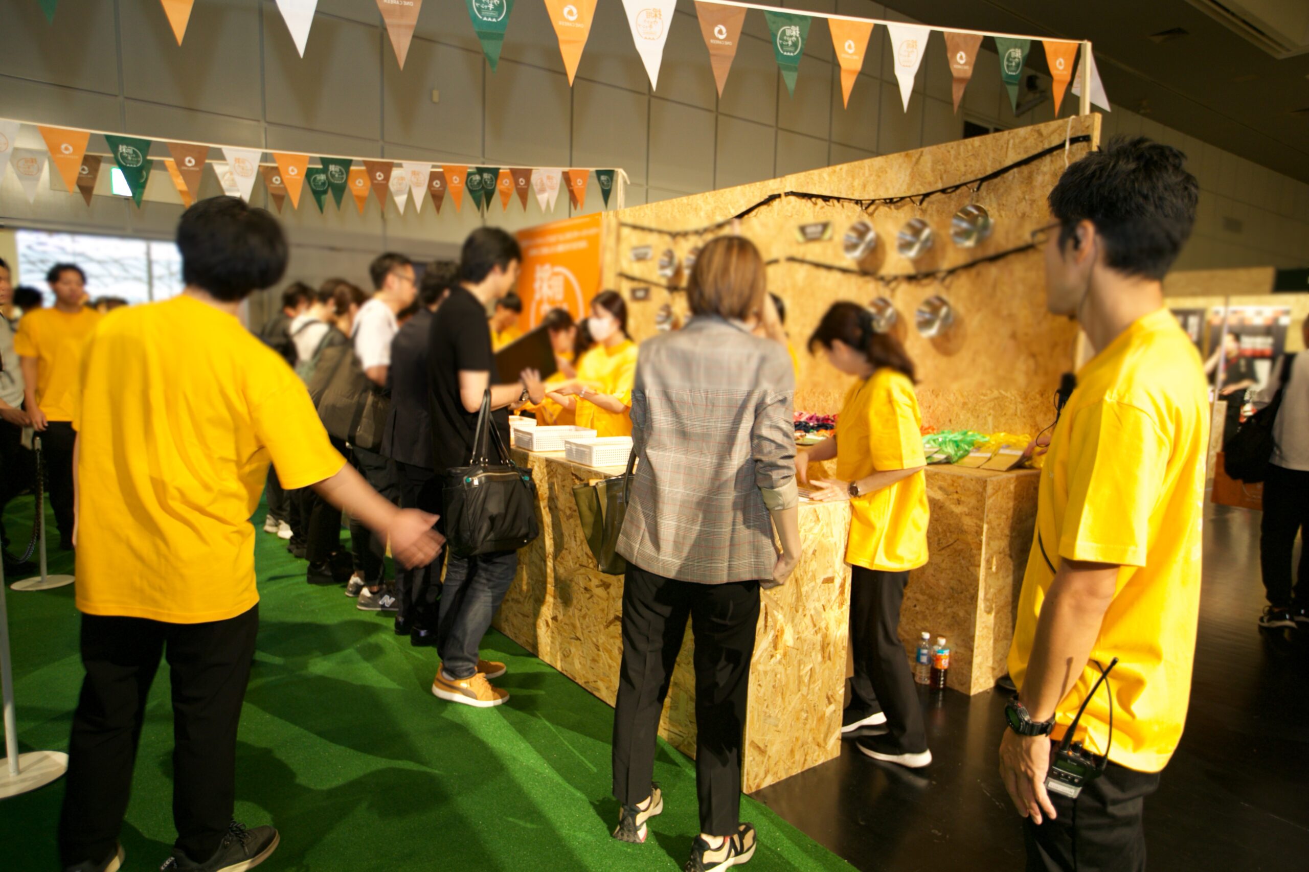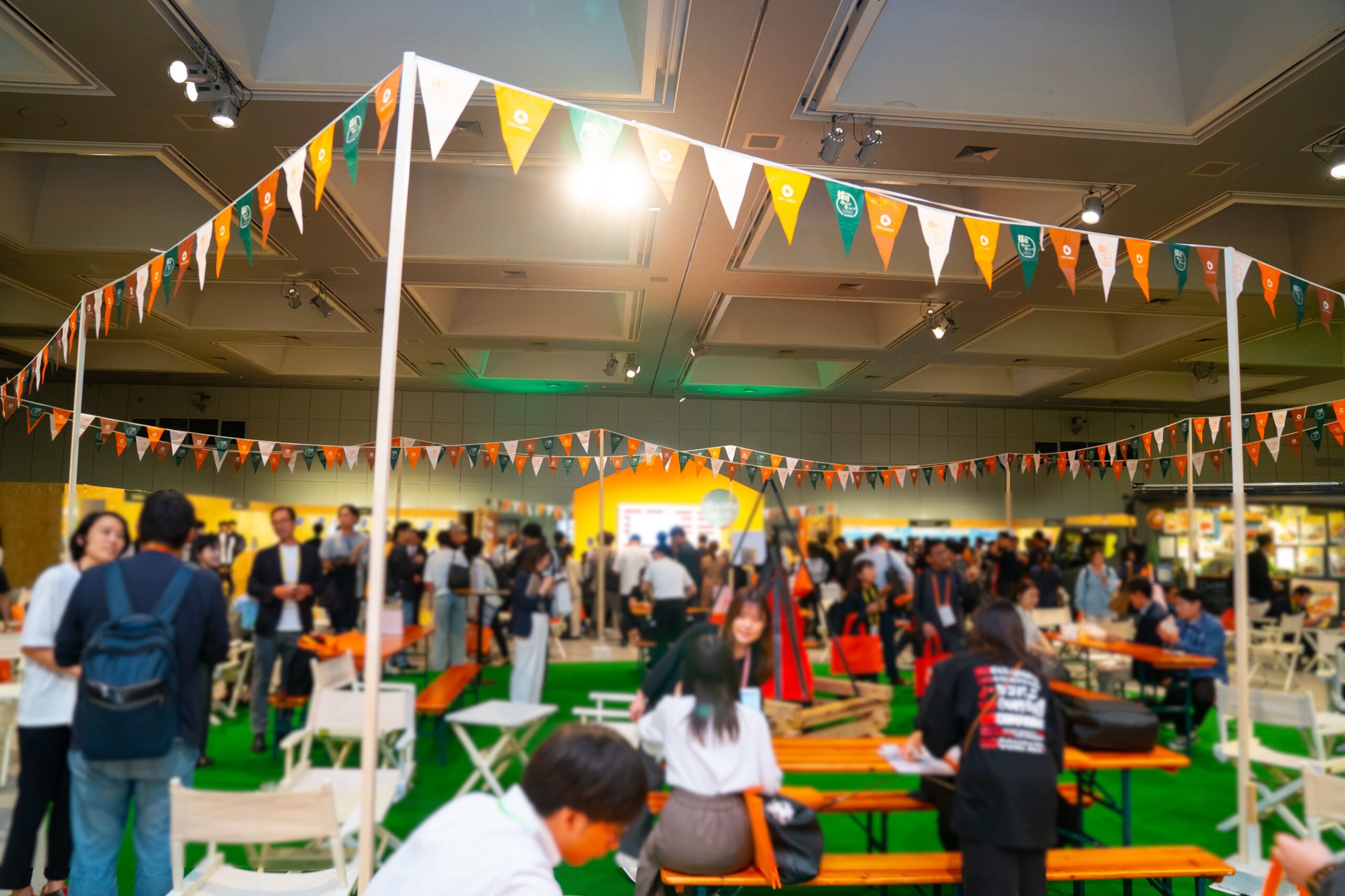 出展ブースや交流エリアにスムーズに足を運んでもらうため、参加者が無意識のうちに会場全体を回遊できるよう、出入口をあえて一箇所に限定する動線設計を採用しました。これにより、人の流れが分散せず、活発なコミュニケーションが生まれる環境を実現。企業・参加者双方にとって有用な接点創出をサポートいたしました。
