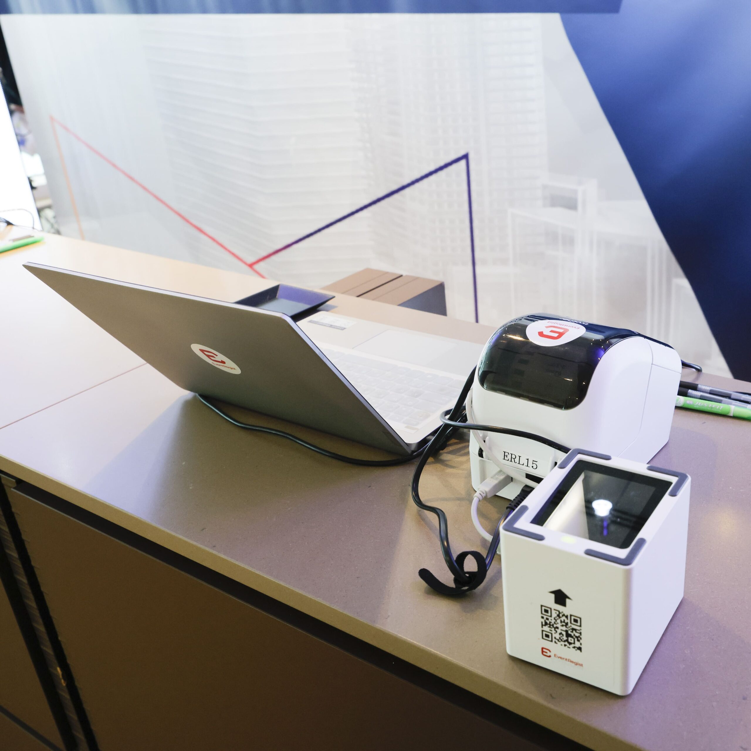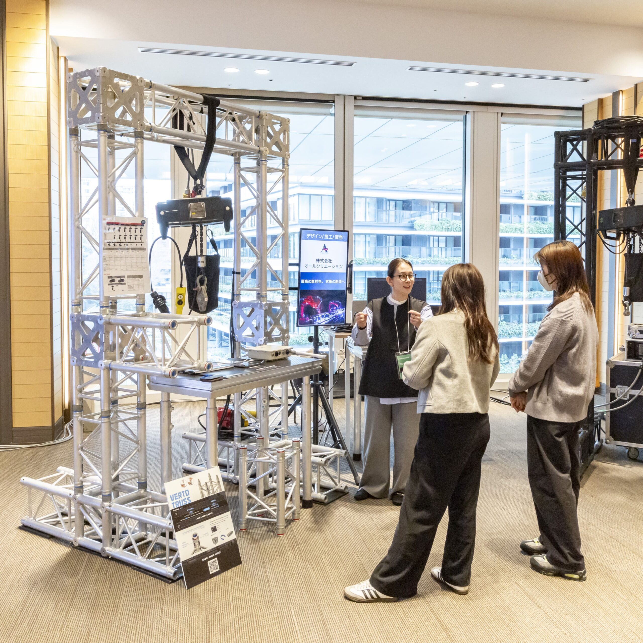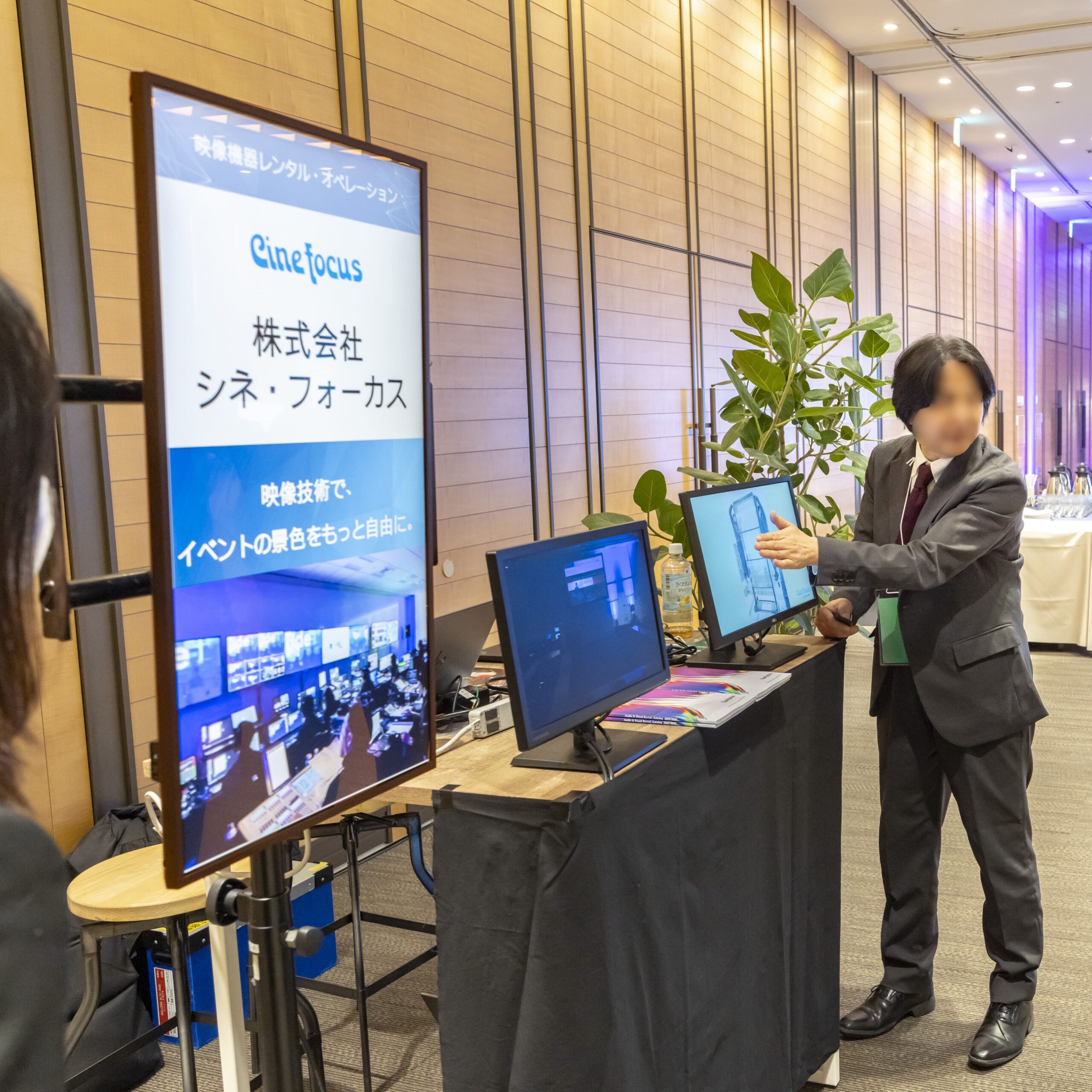 受付バックパネルとしてターポリンバナー、両サイドにはブラインドスクリーン、三角トラスを設置。リアルタイムで会話内容を翻訳する透明ディスプレイも使用しながら、スムーズな受付運営を実施しました。