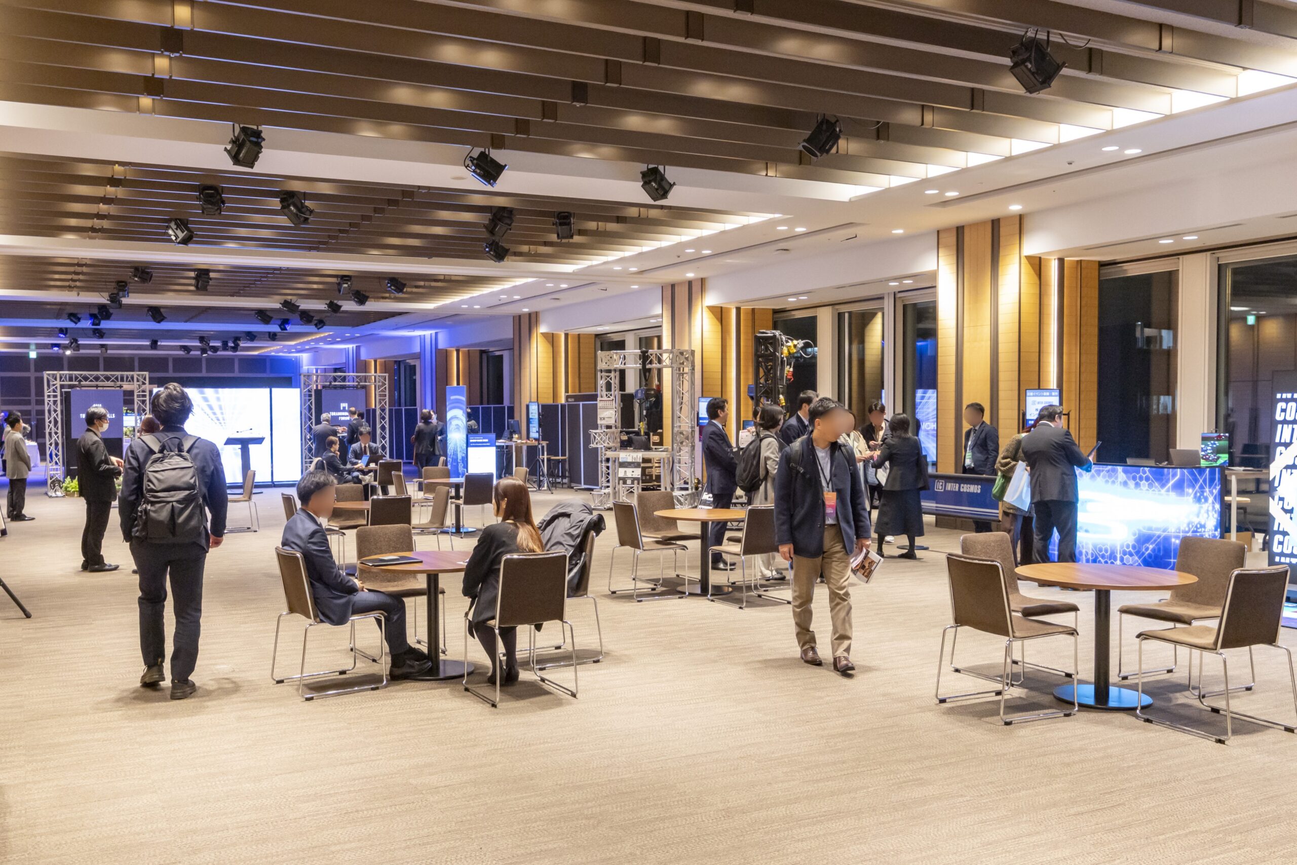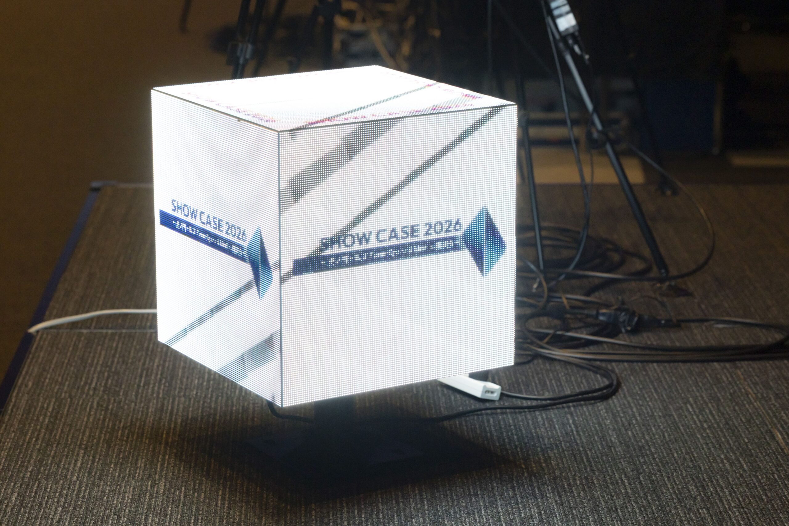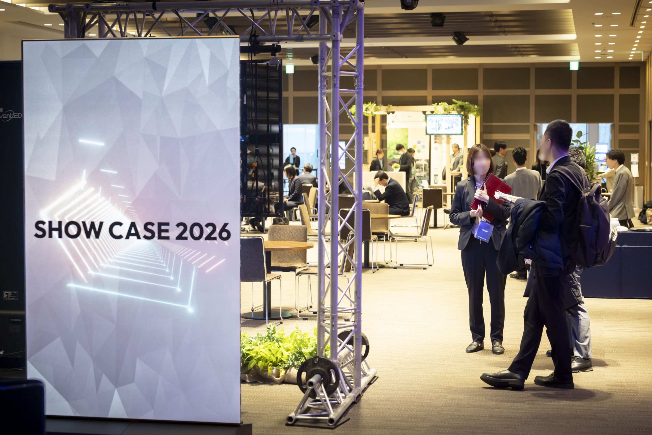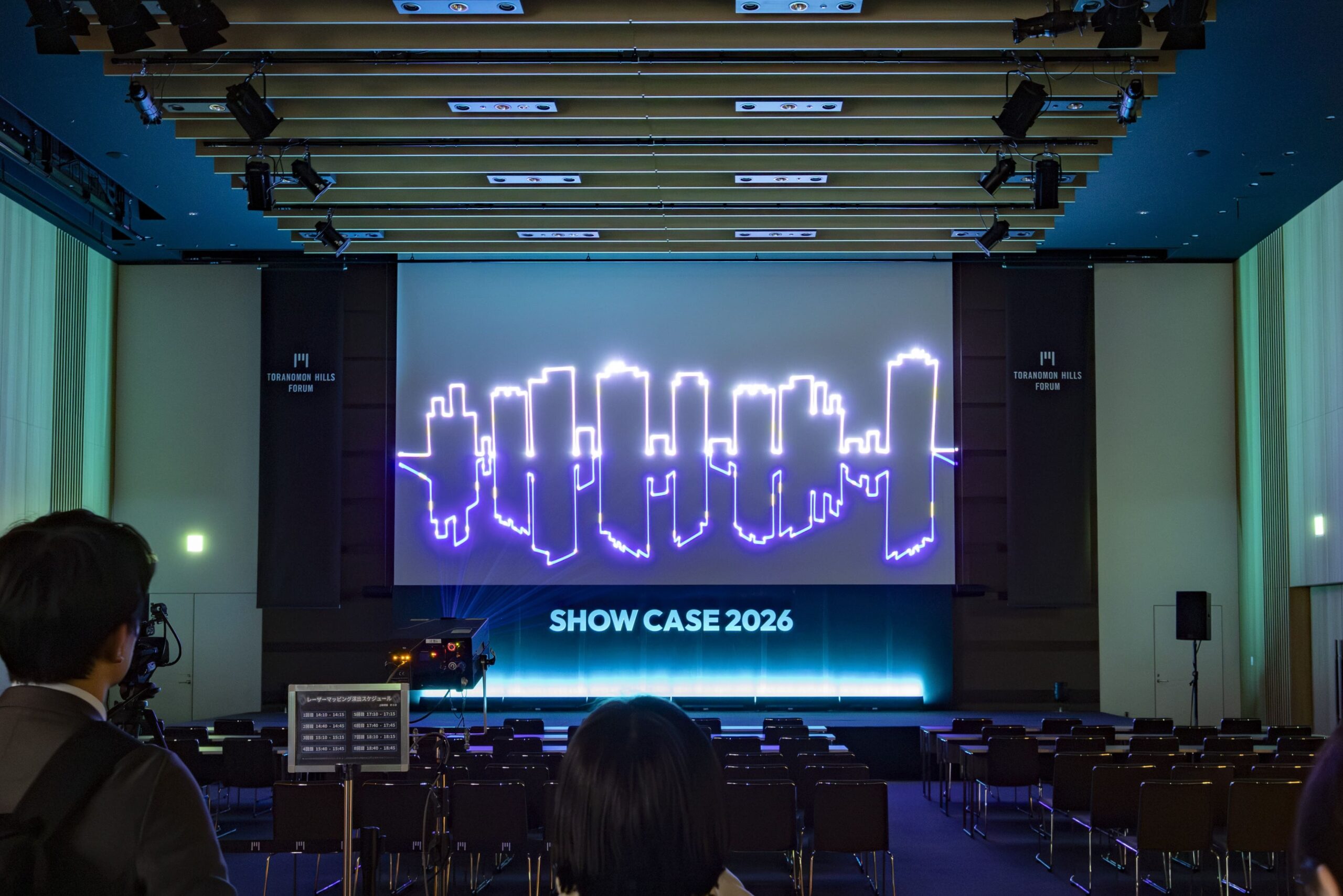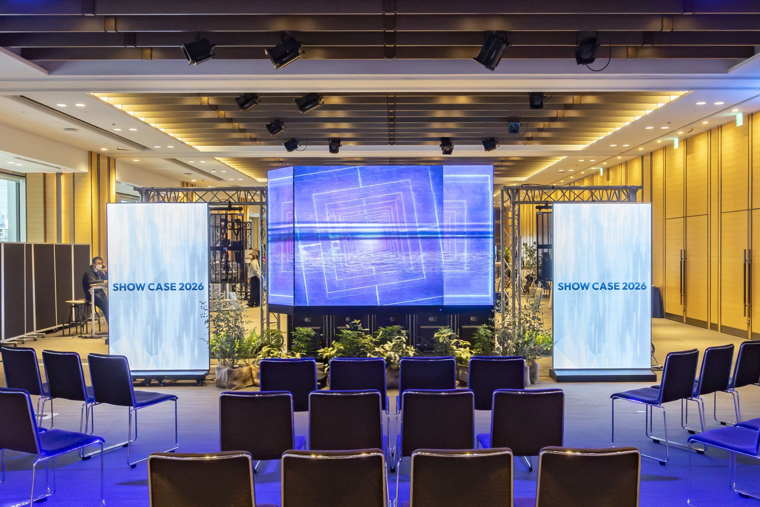 メインホール前方の「ダミーステージ」では、会場に常設された360インチスクリーンを効果的に活用。映像とレーザーマッピングを組み合わせた演出を行い、来場者に強い印象を与えました。サイドバナー、照明演出、木工バックパネルなど、普段のステージ装飾をアップグレードする空間づくりを体感いただきました。
