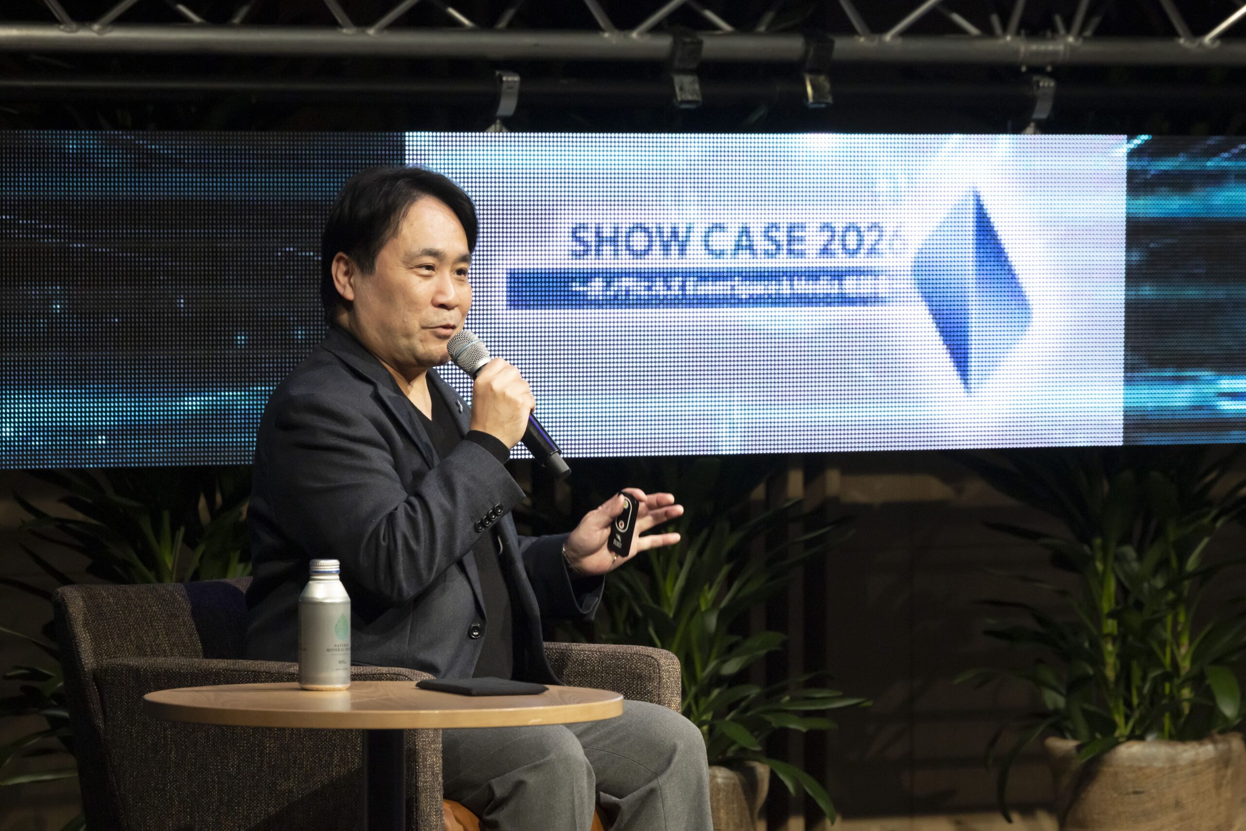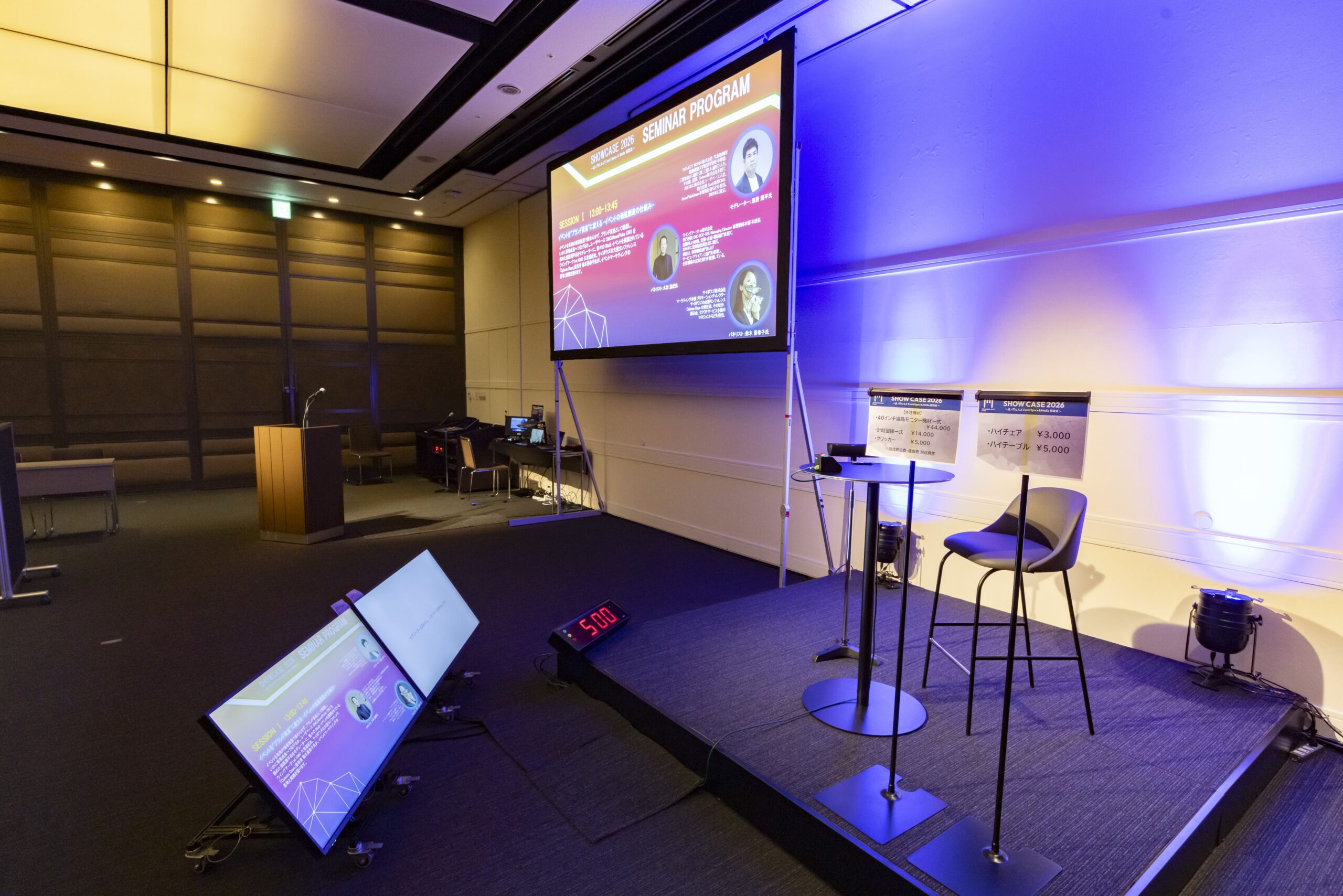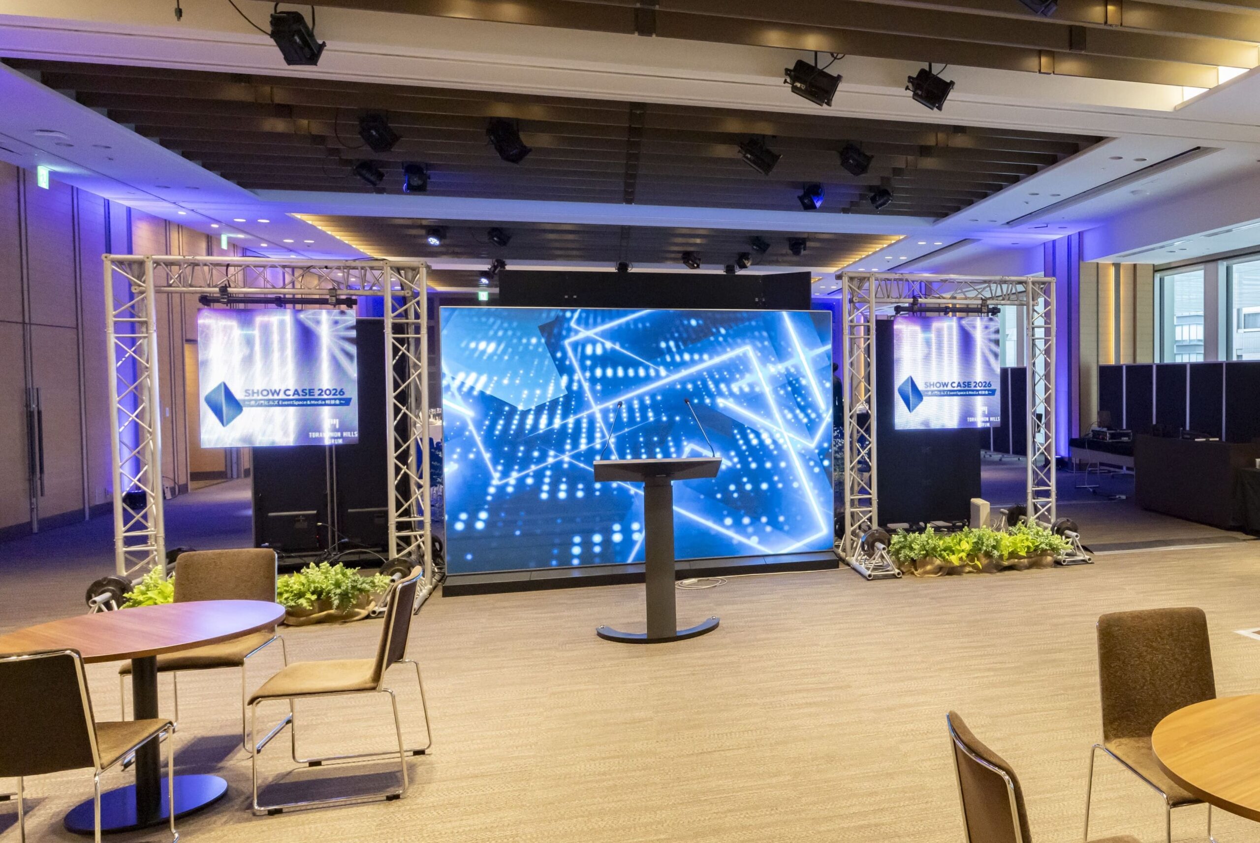 横長の「セミナーステージ」では、275インチスクリーン、三角トラス、ブラインドスクリーンといった多彩な機材を駆使し、セミナーだけでなく、装飾にもこだわった空間を創出。バックパネルの代わりにブラインドスクリーンを使用し、映像演出を組み合わせることで動きのあるステージ演出を行いました。