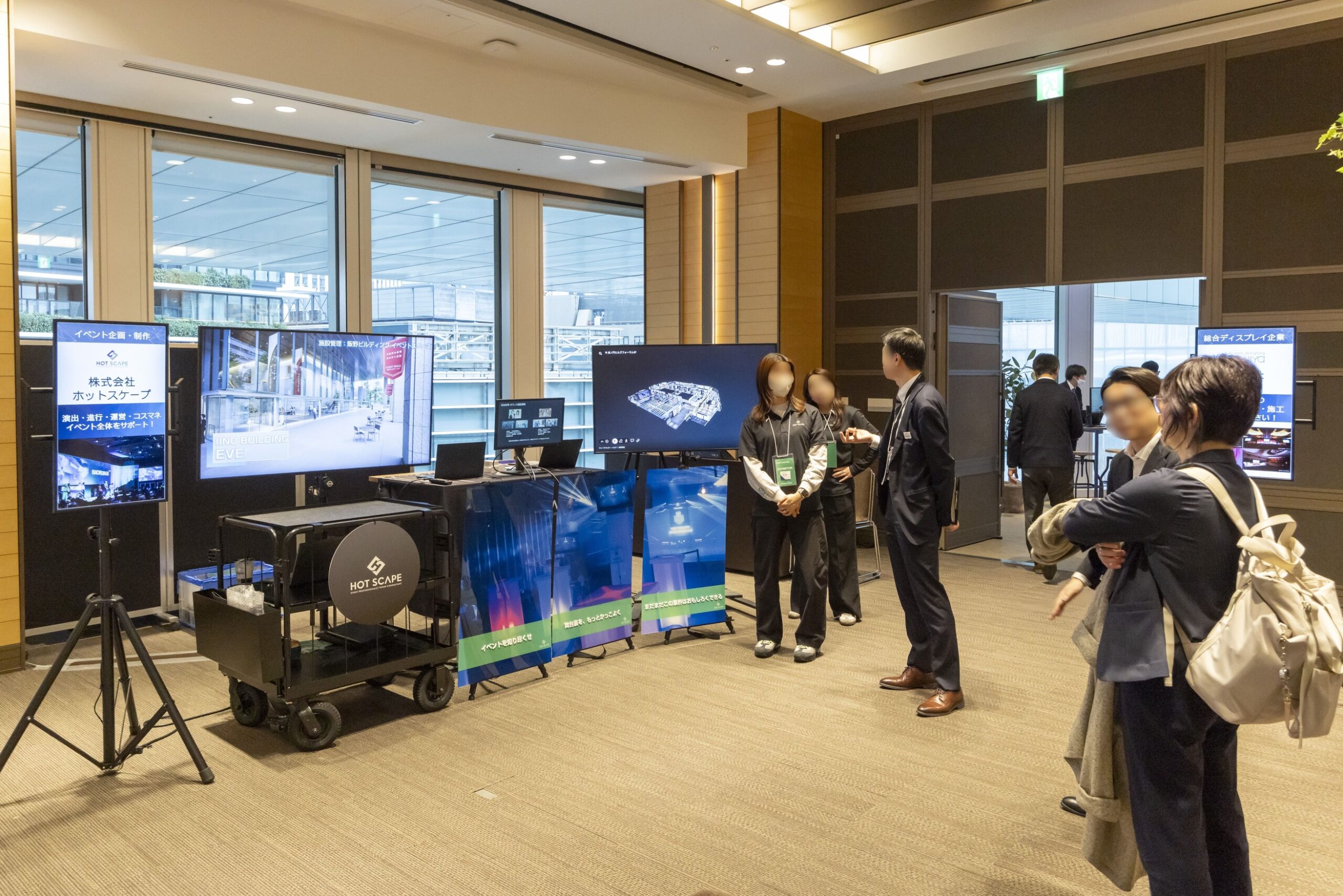 ケータリング・体験&展示・出展ブースのスペースとして活用されたホールAでは、多彩な企画が展開されました。来場者は、展示ブースで最新のイベントテクノロジーを体験したり、ケータリングサービスを試食したりしながら、イベント開催のアイデアを膨らませることができました。また、ホールAホワイエには森ビル施設ブースも設置され、来場者は森ビルの様々な施設やサービスについて情報を得ることができました。