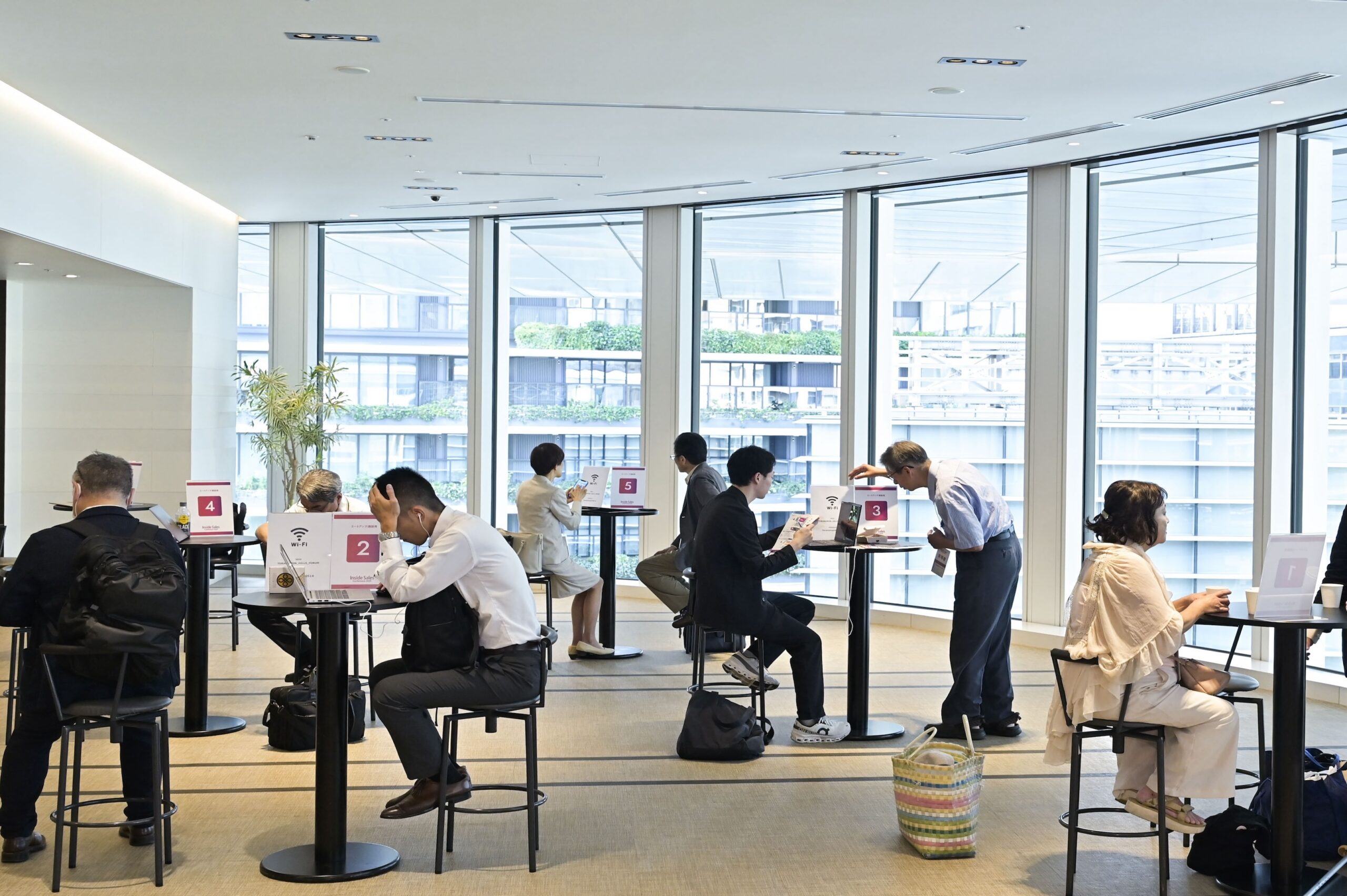 会場設計において、参加者が一部のブースやセッションに留まらず、全体をくまなく回遊する「動線設計」に注力しました。 協賛企業のブース配置をランダムに配置するだけでなく、参加者の休憩や情報交換の場となるケータリングエリアを会場の中央や奥に配置。ケータリングに向かうことで、必ず複数のブースエリアを通過する「強制導線」を作り出しました。これにより、参加者に自然な形でブースに立ち寄る機会を提供し、協賛企業様への高い接触率を実現しました。