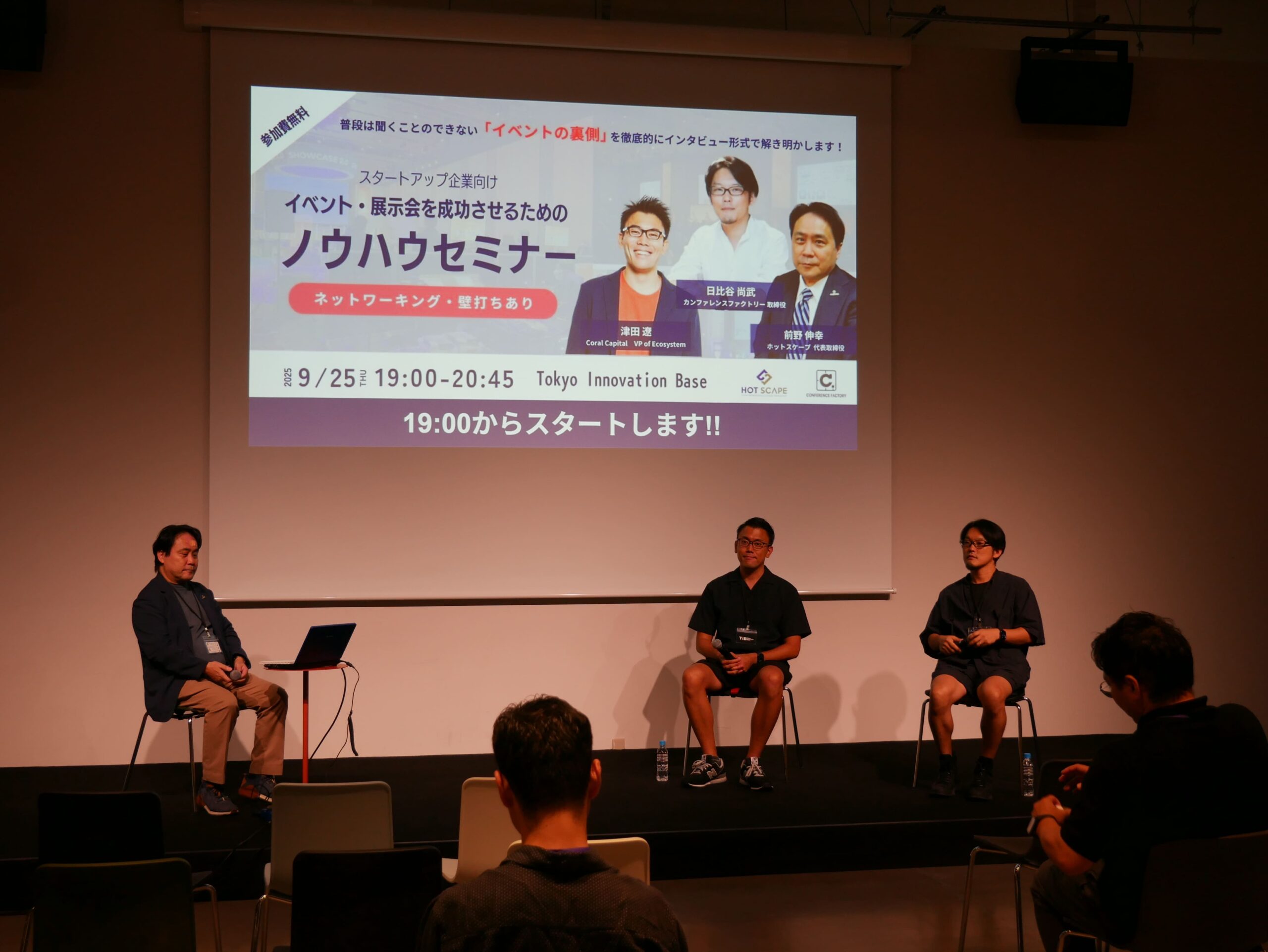 「もう『なんとなく開催』とは言わせない!」をテーマに、イベント企画・運営のプロである前野(弊社代表)、日比谷 尚武氏(カンファレンスファクトリー取締役)、そして津田 遼氏(Coral Capital)が登壇。成果を出すためのイベント設計の「成功方程式」や、見落としがちな予算配分のポイントについて、実践的なノウハウを解説いたしました。